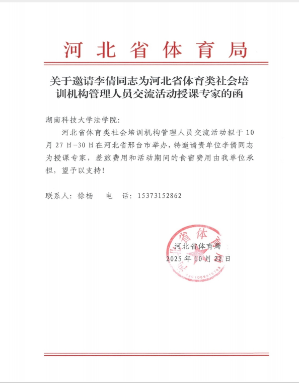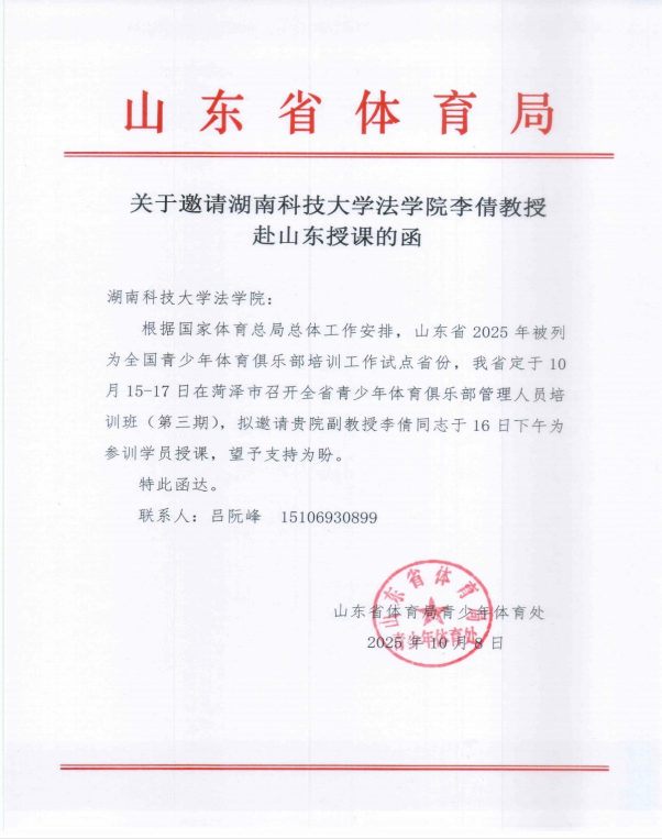 为贯彻落实国家青少年体育工作部署,国家体育总局近年来在全国范围内展开系统化培训以提升青少年俱乐部管理人员专业素养,山东、河北等省体育局也在其省内开展俱乐部管理人员相关培训。我院李倩副教授受国家体育总局和山东、河北省体育局邀请,分别于2025年5月、10月和11月开展“青少年体育俱乐部主要法律风险及其防范”系列讲座。
