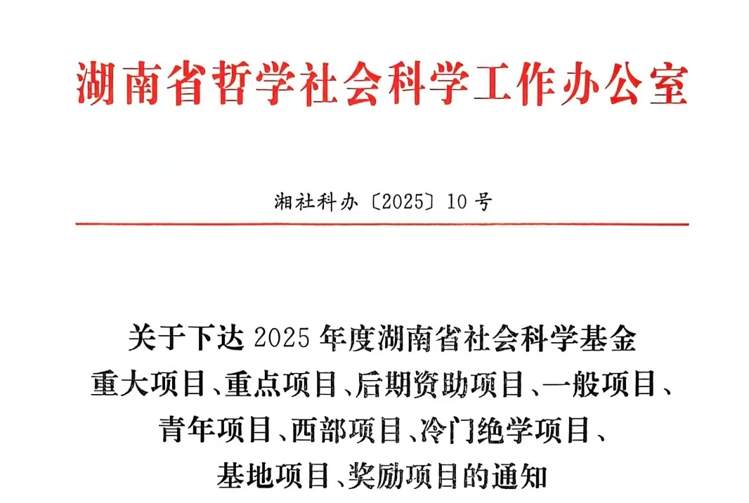 近日,湖南省哲学社会科学工作办公室公布了2025年度湖南省社会科学基金项目立项名单,我院成功获批4项。其中,一般项目两项,青年项目两项。