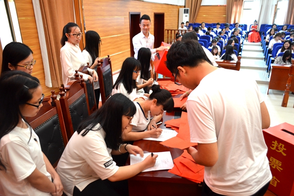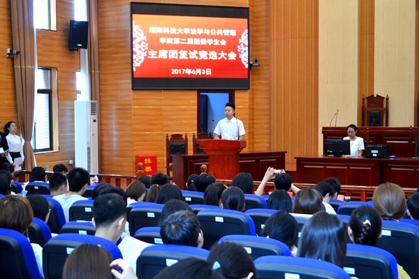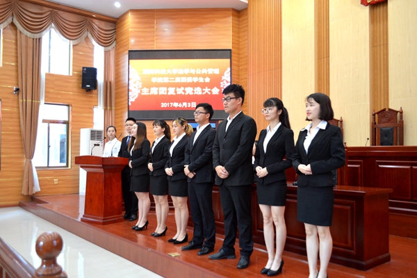 ——我院举行第二届团委学生会主席团复试竞选大会 6月3日上午9:00,法学与公共管理学院第二届团委学生会换届复试选举大会在文科楼3-2模拟法庭顺利召开。本次换届大会的嘉宾有我院党委副书记叶军,辅导员王球云、伍安、刘春生、张惠和王新以及第一届主席团成员,各部门部长,14-16级各班选举代表。 大会第一项,由第一届学生会主席赵文超作上年度学院工作报告。首先,他从工作、经验、成就三个方面对第一届的主席团的工作做了简要的回顾与总结。接着他与大家分享了在过去一年中第一届主席团成员是如何在新学院合并的情况下,披荆斩棘,勇于创新,为学院付出,也使自己成长的历程。最后,他对下一届团委学生会干部们寄予厚望。“坚持自己的理想,记住自己的承诺,创造法管辉煌!” 经过层层筛选,脱颖而出的七位主席团候选人,15法三谭巧俐、15法一杜婧、15公一刘湘相、15公一张艺辉、15公二李禹宏、15公二马晓璇、15法一赵雪燕依次上台做竞选演讲。他们分别向大家展示了个人简历、竞选优势、工作设想等。候选人们个个西装革履,意气风发,朝气蓬勃。 大会的高潮,即投票和计票环节。每个同学拿到投票表都进行了斟酌思考,为自己心目中的最佳人选投出神圣的一票。与此同时,叶军书记也作了最后的总结发言,“从竞选主席团同学们的积极表现中可看出,学生会是一个汇聚青春正能量的地方。我希望新主席团成员能够‘在其位,谋其政,担其责’,扎扎实实地开展工作,用行动来证明自己的能力,用行动来为法管学院添彩。” 经过紧张的计票,大会总监票人龙聪胜为大家公布投票结果。大会结束后,学院领导老师召开会议,结合民主选举票数、考虑诸多因素,随即公布法管学院第二届主席团干部名单:团委第一副书记杜婧,主席李禹宏,团委第二副书记马晓璇,副主席谭巧俐、张艺辉。 (责任编辑:admin) |