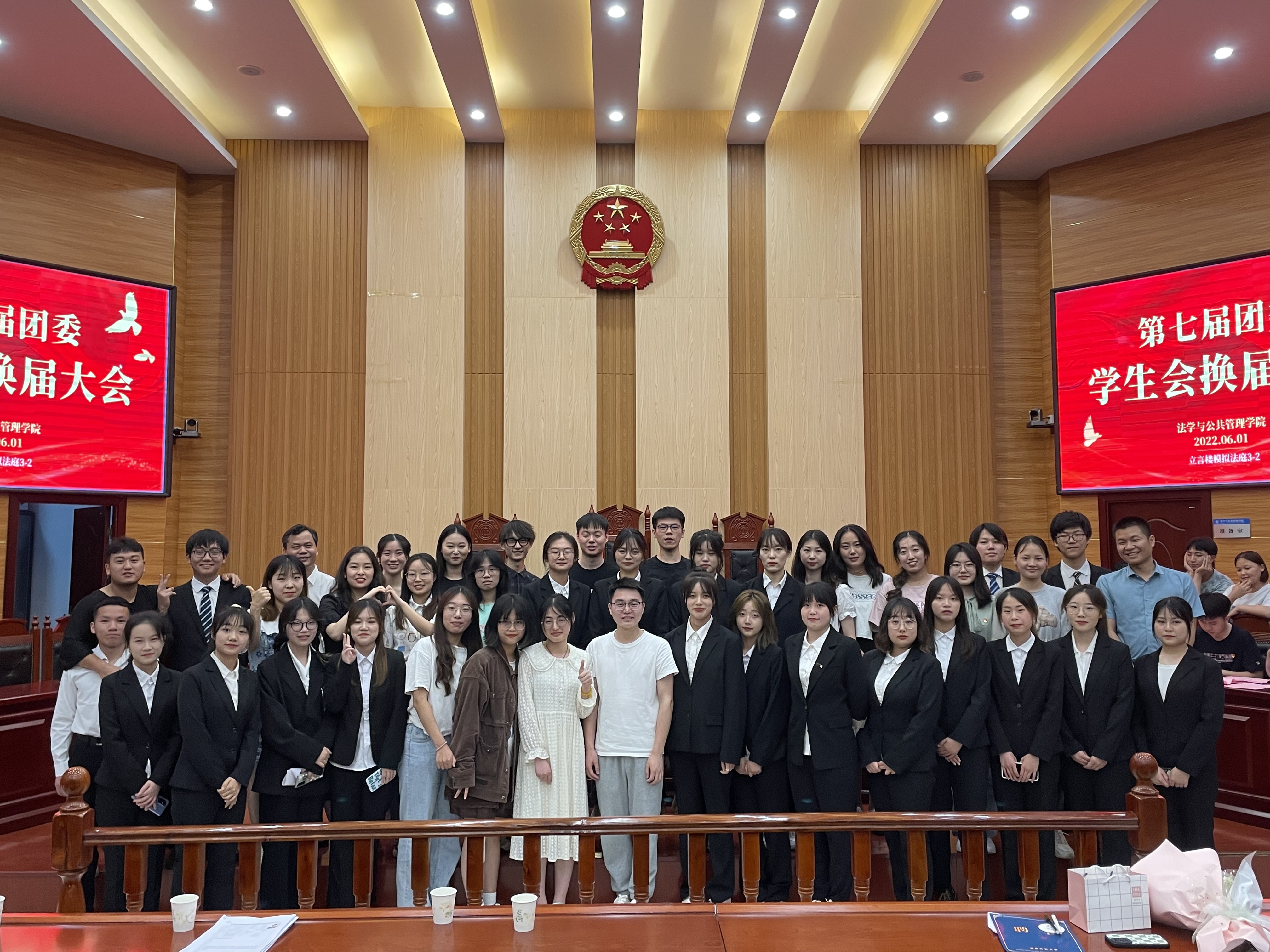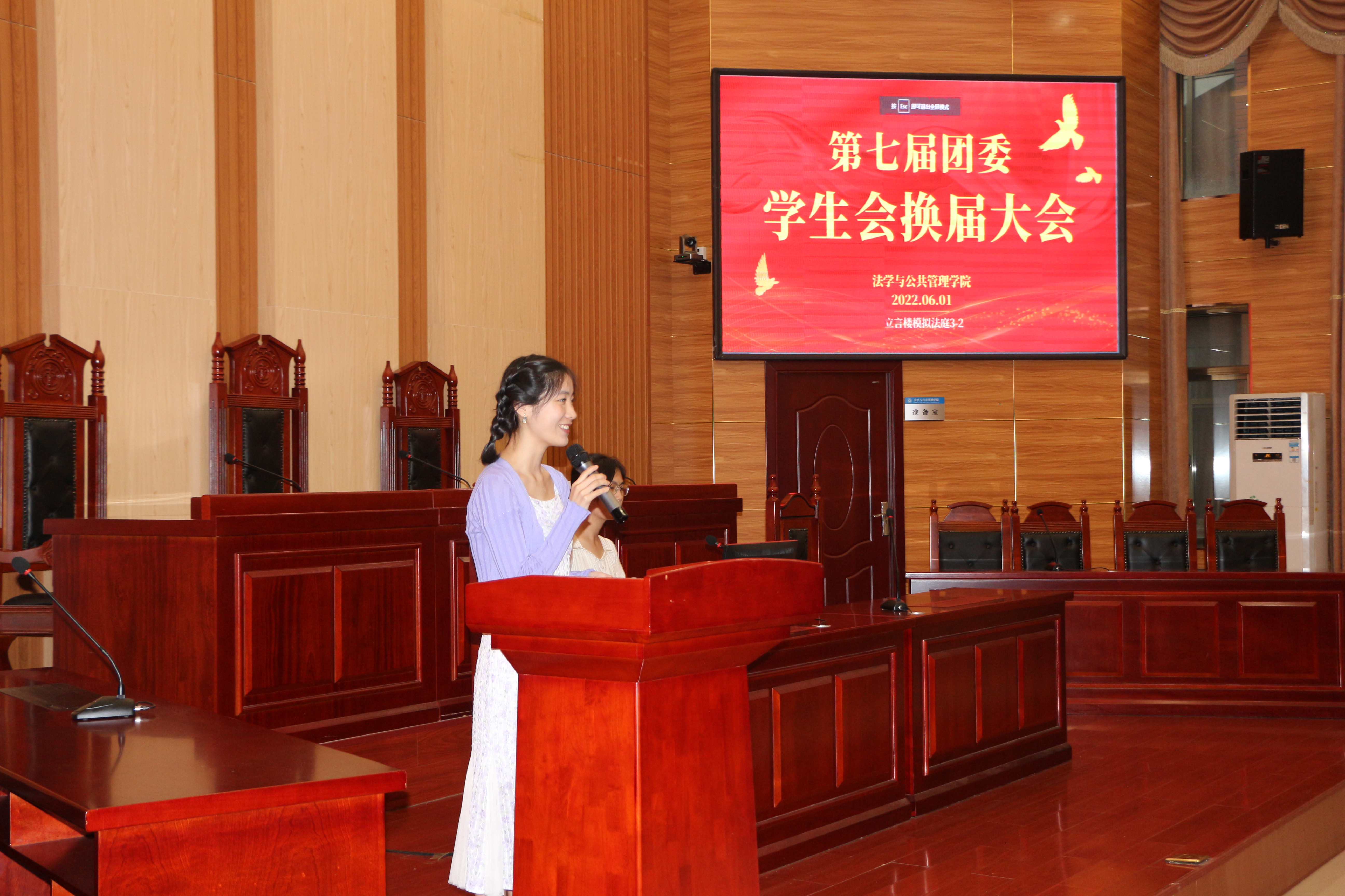 为进一步推进学院学生工作的民主化、科学化、规范化,更好地发挥团委学生会的桥梁和纽带作用,实现其自我教育、自我管理、自我服务的职能,6月1日晚,法学与公共管理学院在立言楼3-2模拟法庭举行了第七届团委学生会换届大会。出席本次会议的有学院党委副书记叶军、学工办副主任郭志军、辅导员李斌、第六届团委学生会主要干部、学院19-21级各班学生代表。本次会议由第六届团委学生会团委第一副书记戴钰莹主持。