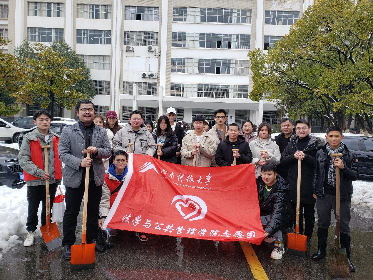本着“服务老师、服务同学”的宗旨,23日上午9点,法学与公共管理学院的青年志愿者们在我院党委书记邱帅萍、副书记叶军、副院长王明以及辅导员李斌的带领下,拿起工具,对我校第九教学楼至北门这一段交通主要干道的积雪进行了及时清扫。