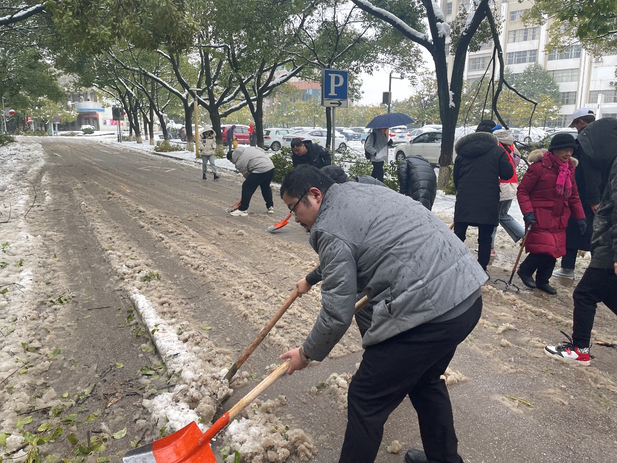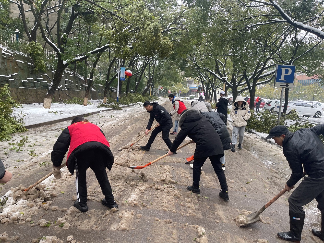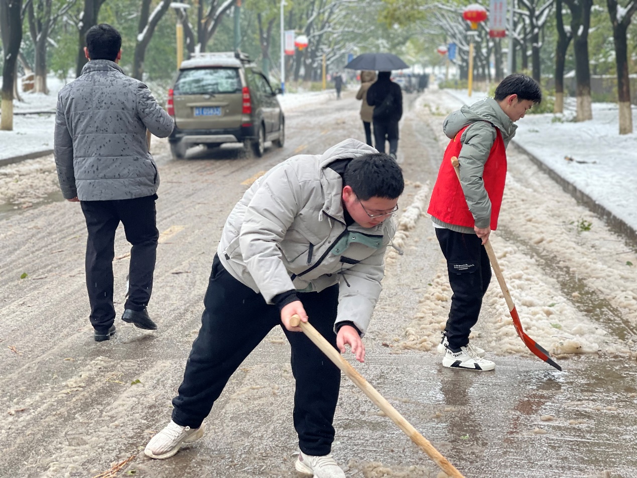 凛冽的寒风不能阻挡志愿者们高涨的热情。在学院领导的指导下,志愿者们立即拿起铲子从路两旁开始铲雪,树上掉下雪的唰唰声和铲子划过地面的声音呼应着。每个人似乎都忘记了时间的流逝和被浸湿的裤袜,顶着寒风以最快的速度将积雪清理干净。看着恢复了畅通、洁净人行通道,大家一上午的辛苦瞬时化为虚有,满满的成就感充斥在每个人的心中。