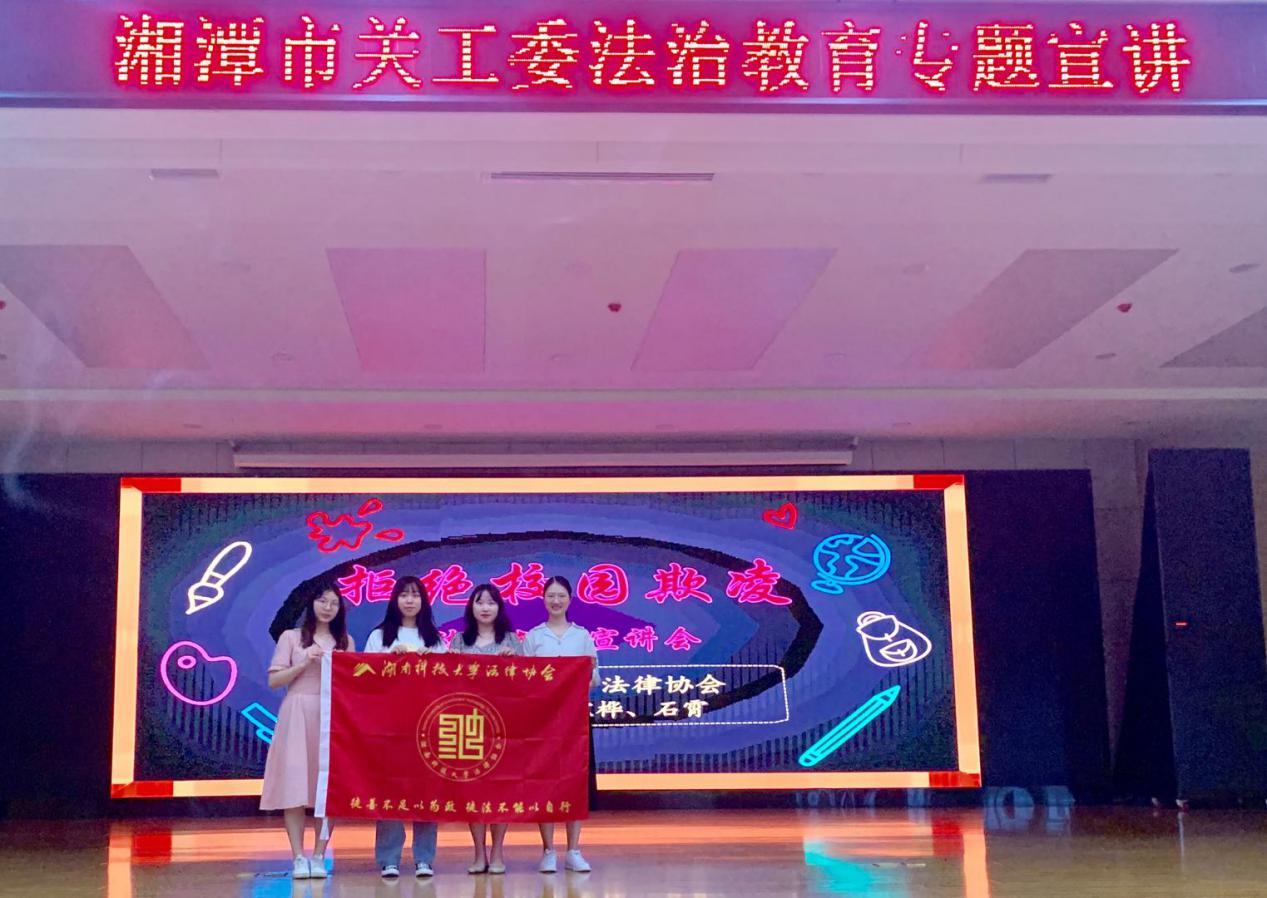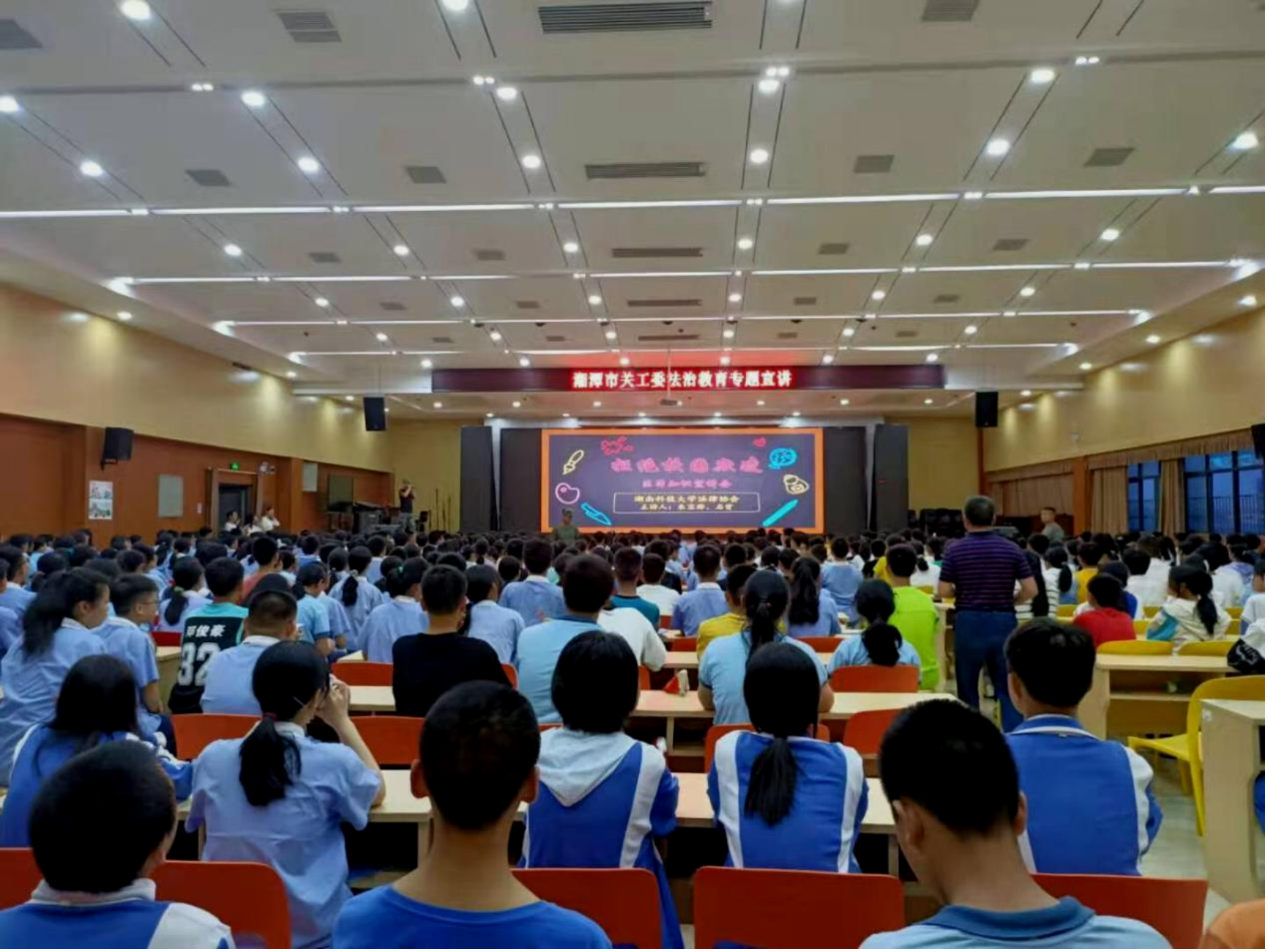 习近平总书记指出,要坚持法治教育从娃娃抓起。为提高青少年法律意识,保护青少年健康成长,2021年5月12日晚,由法学与公共管理学院和法律服务中心联合打造的法律协会法治宣讲团应湘潭市关工委邀请来到湘潭市示范性综合实践基地进行了主题为“拒绝校园欺凌”的普法宣讲活动,来自湘潭市湘纺中学、易家湾镇中学、荷塘中学的500多名学生参加了活动。