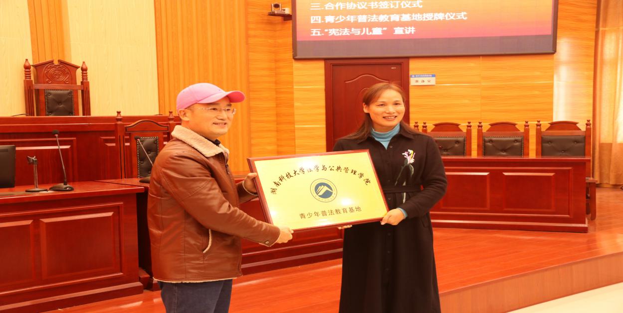 活动开始前,法学与公共管理学院院长徐德刚教授和逸夫小学校长李芳老师分别致辞,并在现场订立了 《湖南科技大学法学与公共管理学院青少年普法教育基地合作协议书》,达成了长期合作意向。徐院长为设立在逸夫小学的普法教育基地进行了正式授牌。