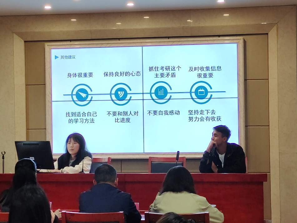 最后,吴四江和戴年红老师分别为活动做出总结。他们对18级优秀学子的经验分享做出充分肯定,并就跨专业、择校等做出着重强调。同时,还告诫大家,在学习时要协调并进,兼顾总分与单科分数,不能顾此失彼。最后,对同学们给予了殷切的期盼,希望明年的考研学子能够不负老师,不负自己,做出最满意的答卷。