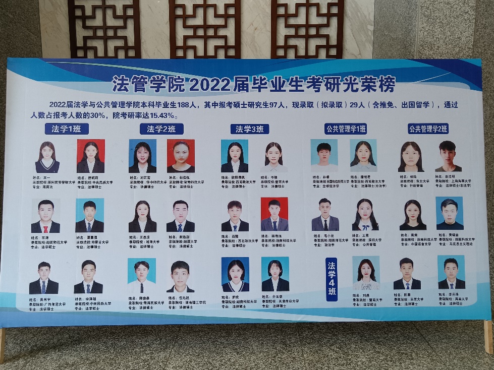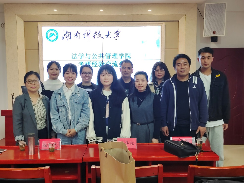 继2022届考研大捷之后,为进一步提振法管学子考研信心,更加深⼊了解有关考研情况,充分做好备考工作,2022年5月12日,在学院领导大力⽀持和精⼼指导下,由法学与公共管理学院主办、就业服务部承办的考研经验交流会在立言楼模拟法庭和425大会议室分系顺利开展。学院副院长宋智敏,法律服务中心主任马驰升,法学系主任吴四江,公管系主任戴年红,法学系夏飞明、周玉利,公管系徐金燕、王慧慧、尚天晓、李凤翔,辅导员朱荣、李斌等多位老师莅临会议。法学欧阳佩佩、李云浩、孙昕文、刘芷若,公管唐艳君、王秀、毛小龙、杨陆等八位18级考研上岸的优秀学子受邀前来进行考研经验交流与分享。法管学院19级本部两个专业和潇湘法学全体学生到场,共享这一场精神盛宴。