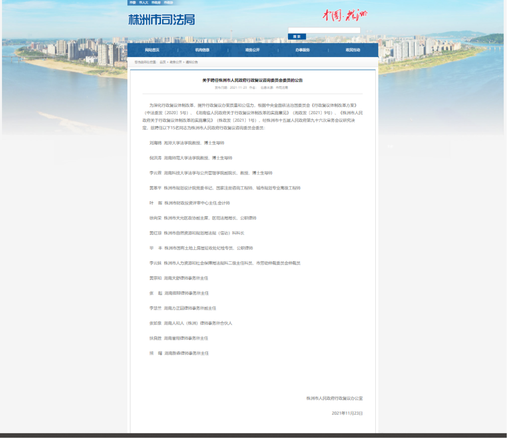 为深化行政复议体制改革,提升行政复议办案质量和公信力,株洲市人民政府根据中央全面依法治国委员会《行政复议体制改革方案》(中法委发〔2020〕5号)等文件精神,组建了株洲市人民政府行政复议咨询委员会。我院李云霖教授被聘为株洲市人民政府行政复议咨询委员会委员。
