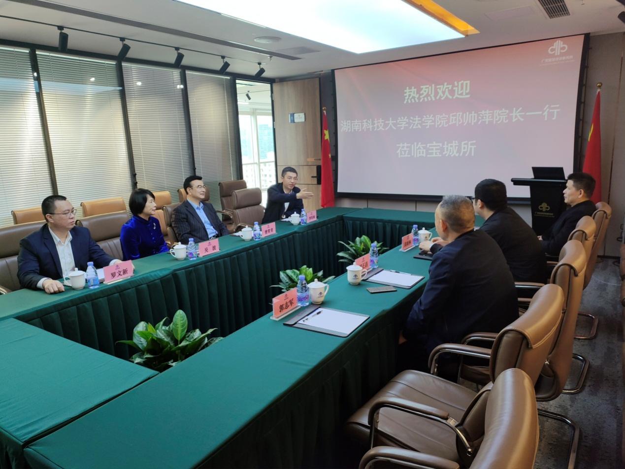 31日上午,邱帅萍一行走访了03级校友李军林担任执行主任的广东宝城律师事务所。律所负责人曾常青、吴波先后发言,表示应加快推进宝城律所建立科大法学教育实践基地建设,拓展法学教育与律师实务之间的相互交流,能够为未来法学生顺利衔接学习与工作,更好地投入社会实践打下坚实基础,希望宝城所与我院能够建立长期、稳定、高质量的合作关系。