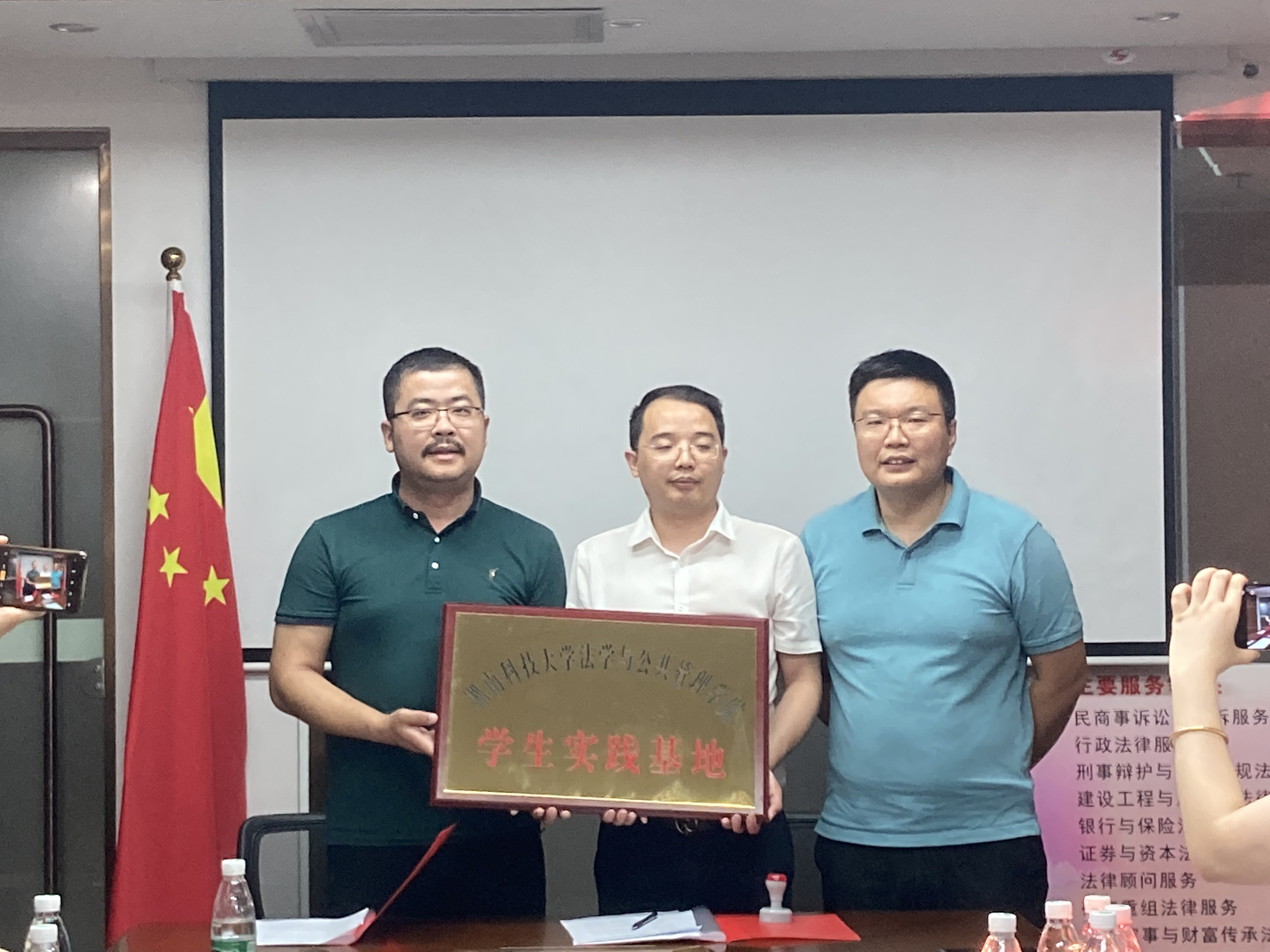 邱帅萍书记代表学院对湖南天润人合律师事务所的律师专业素养和业务能力予以了充分的肯定,并对学院发展、人才培养情况做了简要介绍,期望通过学生实践基地建设的机会保持长期的战略合作关系,实现校企之间相互促进、共同进步。在与会人员的见证下,邱帅萍书记与游宇律师作为双方代表共同签署了战略合作协议并为学生实践基地揭牌。