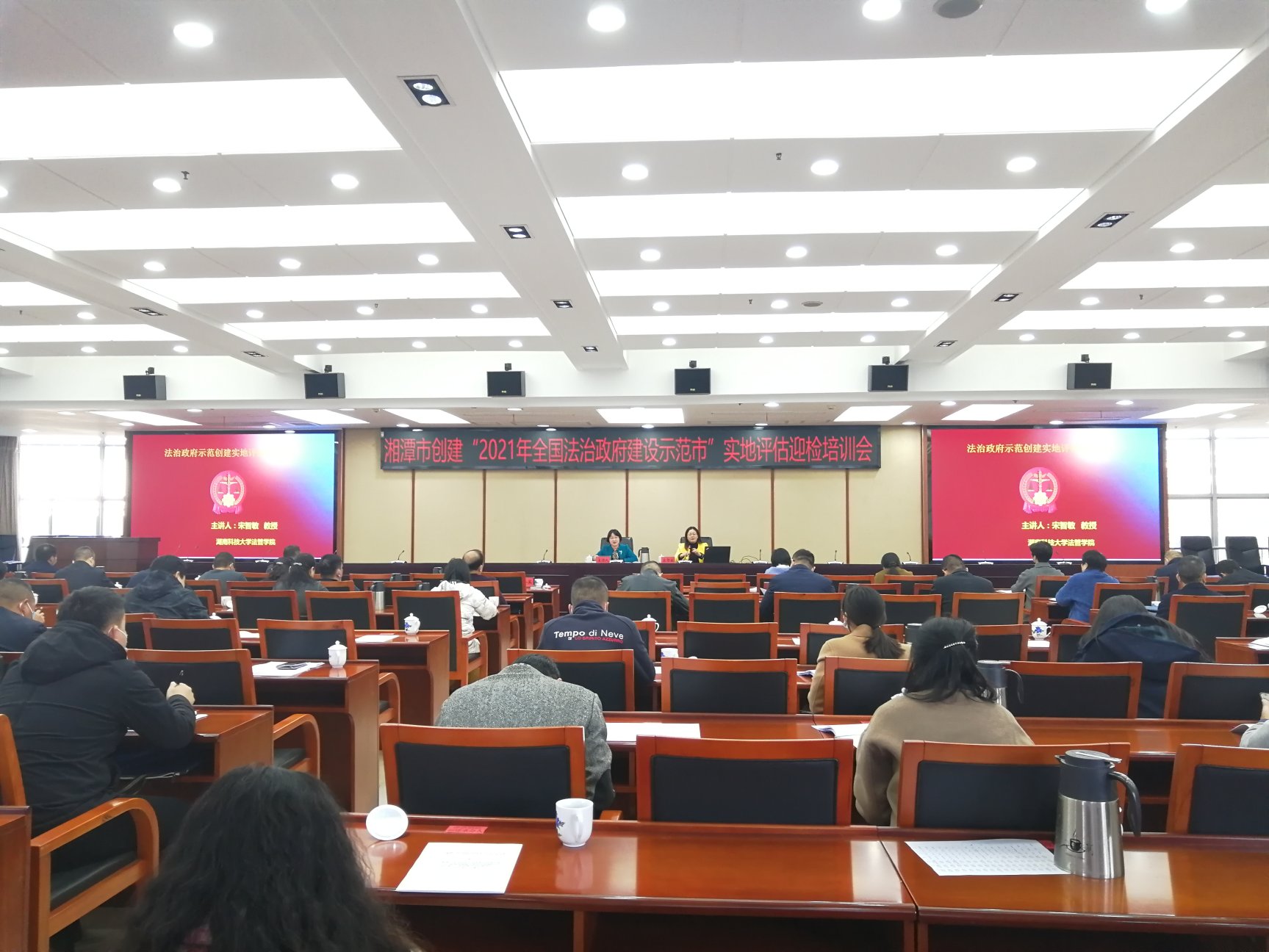2021年12月6日,湘潭市迎接中央依法治国办法治政府建设示范创建实地评估工作推进会在市政府办公大楼五楼全会会议室举行。来自湘潭市政府32个职能部门分管法治工作的领导和各科室负责人近200名干部参加了会议。法学与公共管理学院副院长宋智敏教授应邀做了题为《法治政府示范创建实地评估辅导报告》。研究生区慧霞、李敏、刘冠兰随同学习。