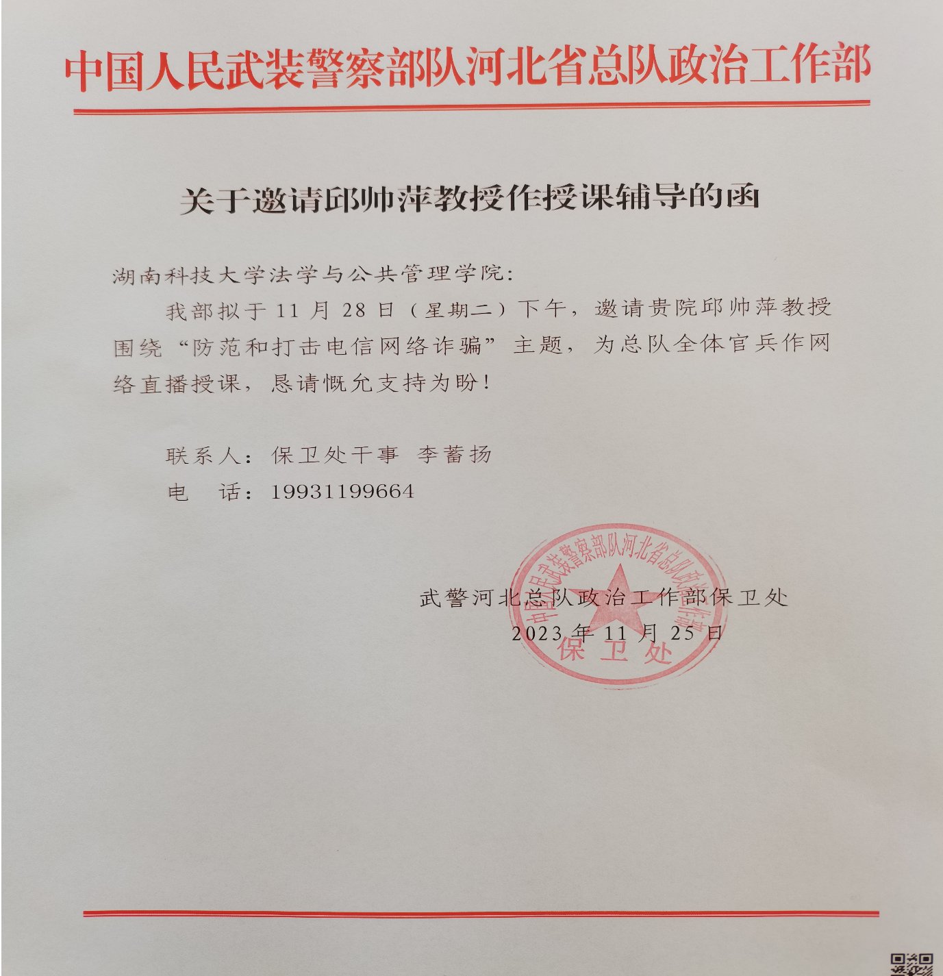 2023年11月28日(星期二)下午,中国人民武装警察部队河北省总队政治工作部邀请我院邱帅萍院长围绕“防范和打击电信网络诈骗”主题,为总队全体官兵作网络直播授课,我院院长邱帅萍教授应邀给官兵将近5000人线上授课。