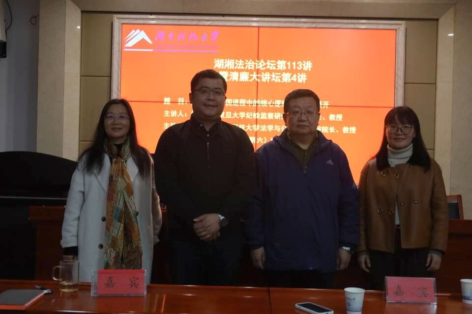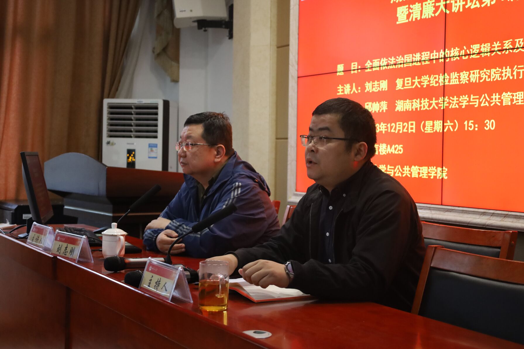 2023年12月2日下午,复旦大学纪检监察研究院执行院长、教授,博士生导师刘志刚教授应邀在立言楼 A425举行湖湘法治论坛第113讲暨清廉大讲坛(原湖湘纪检监察论坛)第4讲,讲座题目为全面依法治国进程中的核心逻辑关系及其展开。出席本次的讲座有湖南科技大学法管学院院长邱帅萍教授、胡之芳教授、黄素梅教授等院领导老师及我院师生近200人参加了讲座。本次讲座由湖南科技大学法管学院院长邱帅萍教授担任主持人。