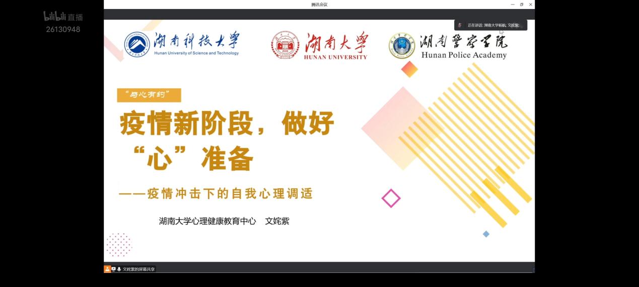 为了帮助同学们更好的应对疫情防控新阶段,适应新冠肺炎疫情防控“新十条”,及时调适在疫情期间产生的一些心理问题,湖南科技大学、湖南大学和湖南警察学院共同举办了线上讲座——疫情新阶段,做好“心”准备。本次讲座于12月21日16:00顺利开展,它借助哔哩哔哩平台向同学们详细的讲解了心理知识,传授了缓解压力的方法,为正处于迷茫、恐惧阶段的广大同学提供了新思路。
