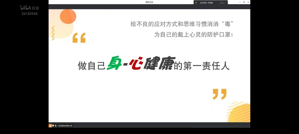 总体来说,本次讲座取得了较大的成效,它使同学们在了解自身情况的同时缓解了焦虑,为同学们舒缓情绪、保持身心健康提供了良方。讲座在为广大学子如何应对疫情出谋划策的同时也为学子们以后的生活、学习带来了启发:我们在做好身体防护的同时还应给不良的生活方式和思维习惯消消“毒”,为自己带上心灵的防护口罩,做自己身心健康的第一责任人。