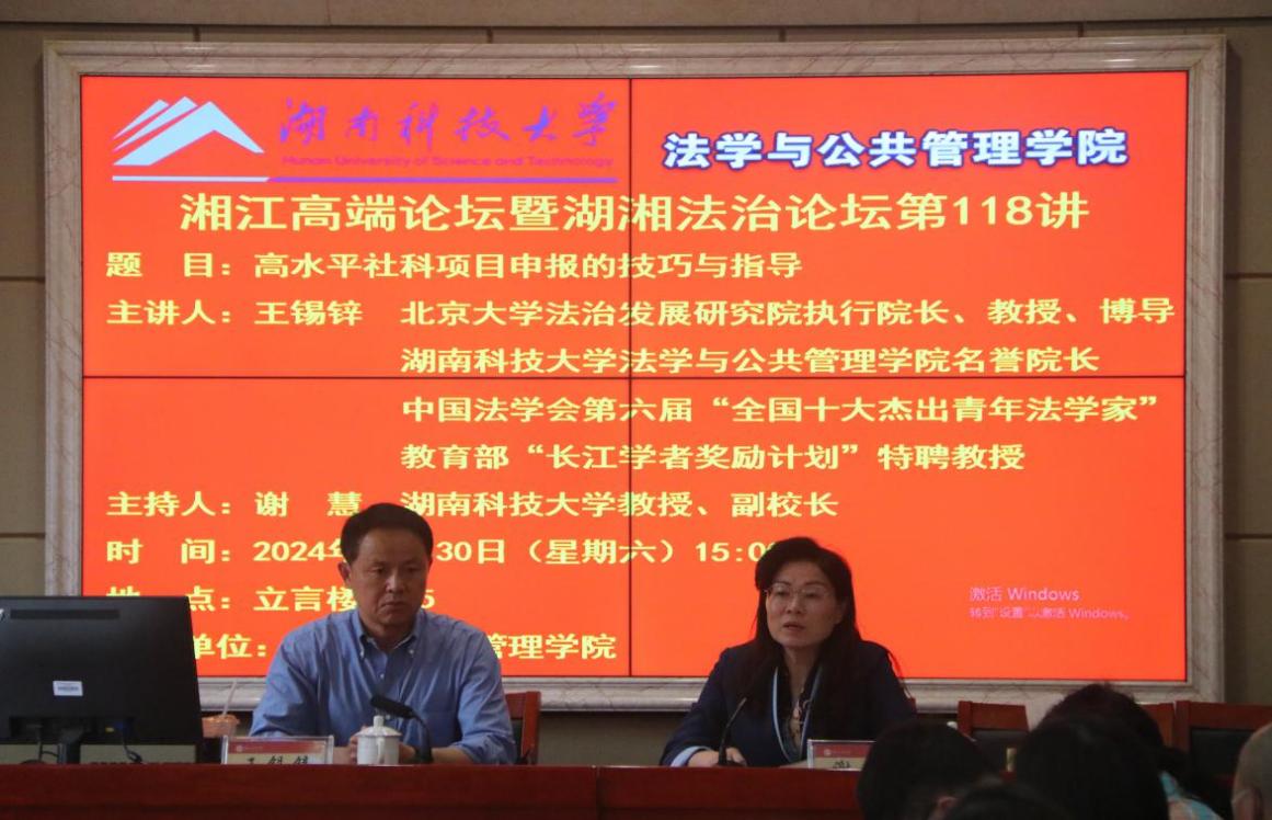 2024年3月30日下午,我院名誉院长、北京大学法治发展研究院执行院长、教授、博士生导师、中国法学会第六届“全国十大杰出青年法学家”、教育部“长江学者奖励计划”特聘教授王锡锌教授应邀在立言楼A425开展主题为“高水平社科项目申报的技巧与指导”专题讲座。出席本次讲座的有湖南科技大学副校长谢慧教授、法学与公共管理学院党委书记郑海祥、副院长宋智敏、徐德刚、喻军、胡之芳、马驰升、刘鄂、李倩等学院领导及师生共100余人参加了讲座,本次讲座由谢慧副校长担任主持人。