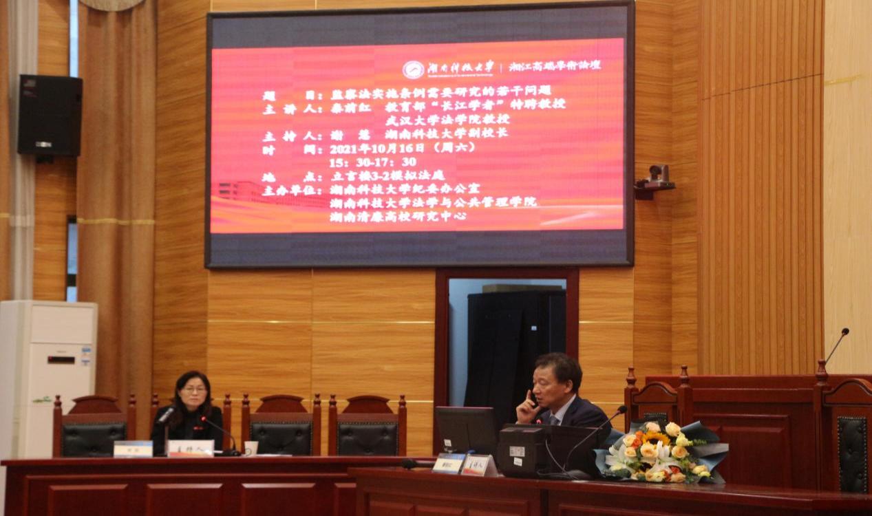 2021年10月16日下午,教育部“长江学者”,武汉大学博士生导师,《法学评论》主编秦前红教授应邀来我校开展了“监察法实施条例需要研究的若干问题”的专题讲座。本次讲座由我校谢慧副校长主持,校全体纪检监察委员、湖南清廉高校研究中心成员、法管学院师生到场聆听讲座。