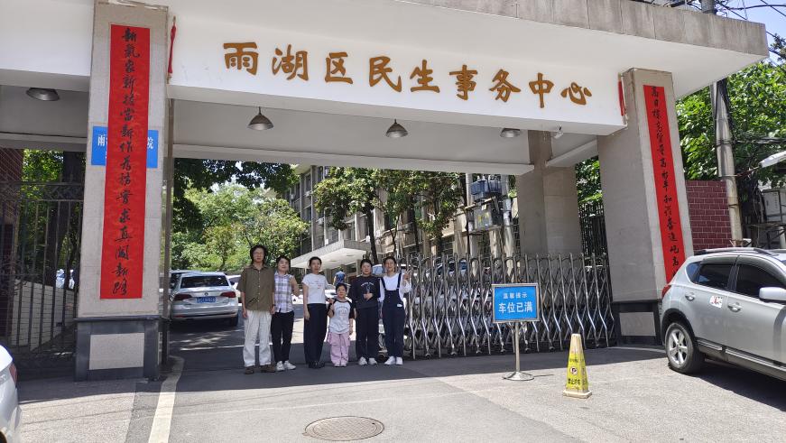 ▲公管学子肖盼等在实习单位门前合影
