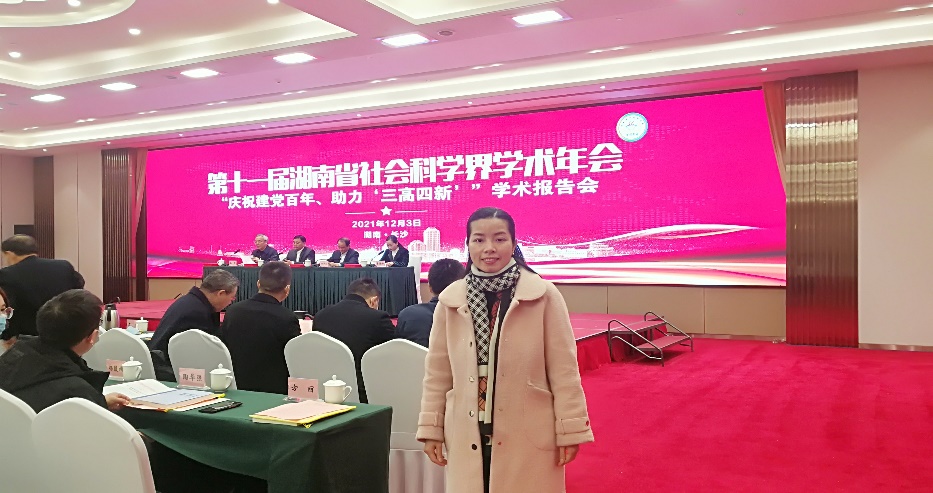 2021年12月3日上午9点,第十一届湖南省社会科学界学术年会在长沙市蓉园宾馆举行。湖南省社科联主要领导干部,省级社科类社会组织、省级社科普及基地相关负责人,高等院校相关负责人,论文获奖代表,新闻媒体代表等两百余人参加会议。我院徐金燕老师作为年会论文特等奖获得者,应邀参加会议。