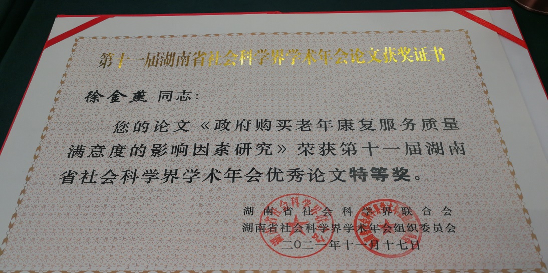 会议通报表彰了本届湖南省社会科学界学术年会优秀论文,并为特等奖、一等奖获得者代表现场颁奖。今年4月,省社科联以“庆祝建党百年、助力‘三高四新’”为主题,面向全省社会科学界开展第十一届湖南省社会科学界学术年会征文活动,共征集论文500余篇,评出优秀论文128篇。我院徐金燕老师撰写的《政府购买老年康复服务质量满意度的影响因素研究》荣获特等奖。