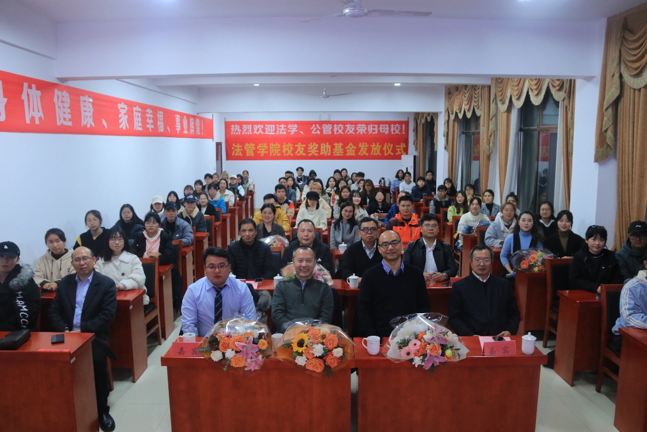11月27日晚7点30分,法学与公共管理学院校友奖助基金发放仪式在立言楼425会议室隆重举行。出席本次活动的优秀校友有贵州校友会法学分会会长、法管学院校友基金理事会主席朱小波先生,贵州校友会法学分会副会长、法管学院校友基金理事会理事徐伏良先生,深圳校友会法学分会会长、法管学院校友基金理事会理事陈科军,大湾区校友会法学分会会长、法管学院校友基金理事会理事谢兰才先生,大湾区校友会法学分会秘书长、法管学院校友基金理事会理事陈悦英女士,长沙校友会法学分会会长、法管学院校友基金理事会理事韩祥先生,长沙校友会法学分会秘书长、法管学院校友基金理事会理事李萍女士,及公管01级校友冯玉峰先生,法学校友李妲。出席本次活动的嘉宾有学院党委书记黄伟、副院长胡正昌、副院长李云霖、副书记蒋会平和系部教师代表戴年红、喻军、夏飞明,以及学工全体老师,获奖学生代表、学生干部代表参加活动。