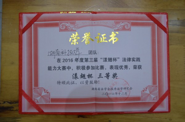12月3日至12月4日,湖南省第三届“漾翅杯”法律实践能力大赛在湖南师范大学法学院举行。我院2015级李启威、张益、徐磊、王静四位法学系同学,组成湖南科技大学代表队参赛,法学系副主任刘鄂和刘敏老师带队指导。 本次竞赛通过抽签决定原告方、被告方和庭审方,由竞赛委员会提供民事案例,分庭前程序和庭审阶段进行两天的对抗。比赛着重突出起诉、受理、应诉,庭前会议以及开庭审理等基本环节。我院代表队作为庭一被告方,最终以94.62的高分,在参赛的十二个代表队中排名第三,并获得团体三等奖的好成绩。其中,张益同学获“杰出诉讼能力”一等奖,王静同学获“杰出书记员”二等奖,徐磊同学获“杰出诉讼能力”三等奖。刘敏老师个人也荣获“杰出指导能力”二等奖。 第三届漾翅杯法律实践能力大赛,响应了中国法学会“法治文化进校园”的要求,通过法律实践能力竞赛,面向当代大学生弘扬法治精神,传播法律知识。我院代表队运用法律学习者的思考方式,从实际出发解决问题、化解矛盾,体现了他们的法治思维,更彰显了我院理论结合实务教学能力之强大,誓为国家培养合格法律人的决心和意志。 (责任编辑:admin) |