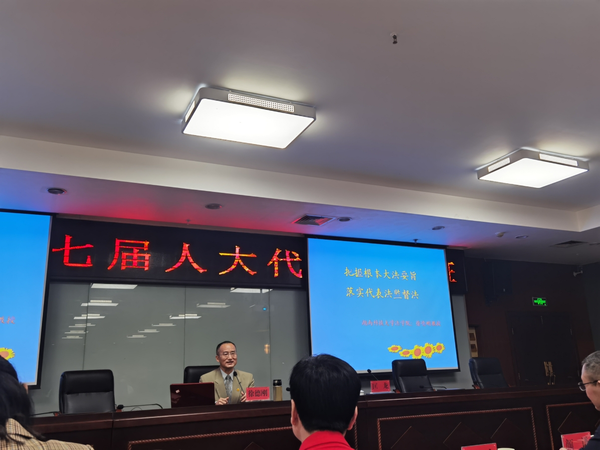 讲授在代表们的热烈掌声中展开,徐教授首先从生活中的现象导入,带领大家理解宪法与每个人的关系,指出宪法是国家的根本大法,也是公民的生活之法,随即详细介绍了宪法的主要内容,让各位代表对宪法框架有了基本了解。