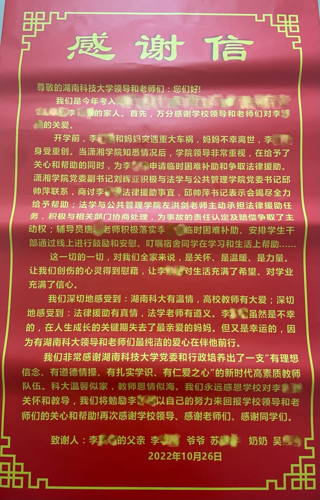 “湖南科大有温情,高校教师有大爱。”近日,湖南科技大学法学与公共管理学院收到了一封特别的感谢信。该感谢信来自一位与我们年龄相仿的学生的家长,信中,字里行间满溢着对湖南科技大学法学与公共管理学院在他们面对突发变故时毫不犹豫伸出援助之手的真诚感谢。字字真情,句句感人,深入人心。